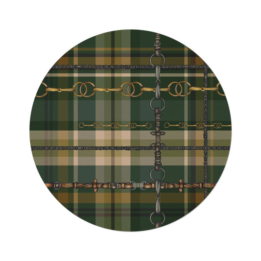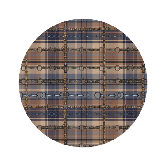 Brown Dressage snaffle bit Plaid Equestrian Art Round Rug. Original Art Rug. Show Stall Rug Home Decor