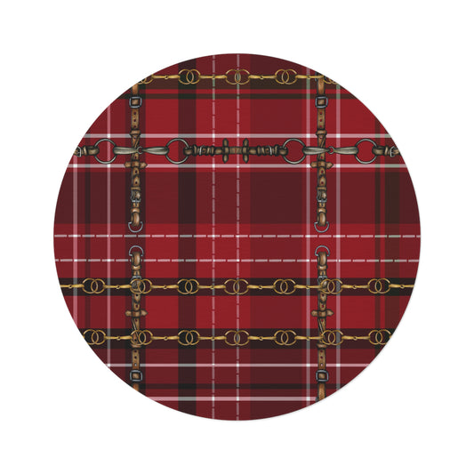 Red Plaid Equestrian Art Round Rug. Western Horse Original Art Rug. Show Stall Rug Home Decor