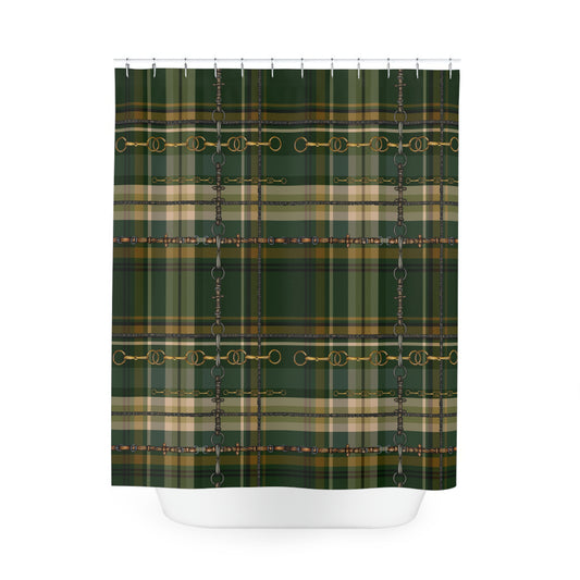 Hunter Green Plaid and Snaffle bit and stirrup pattern Polyester Shower Curtain. My original equestrian art work printed on a shower curtain.