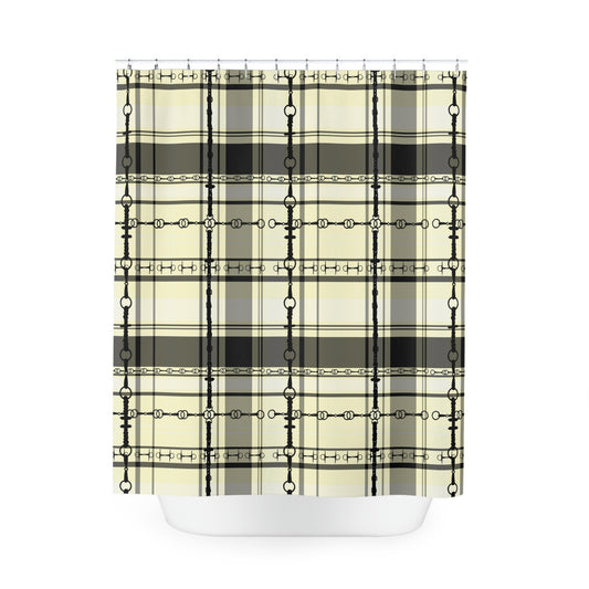 Ivory cream pale yellow Plaid with Snaffle bit pattern overlay Polyester Shower Curtain. My original equestrian art work printed on a shower curtain.