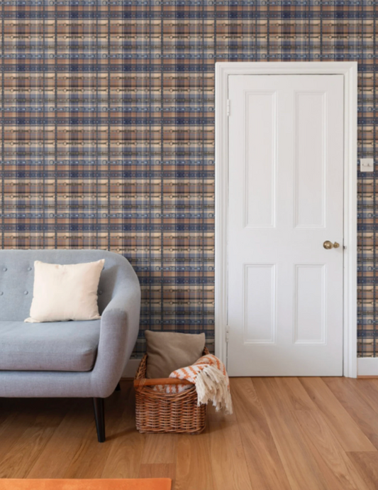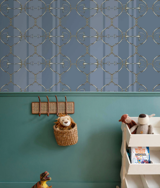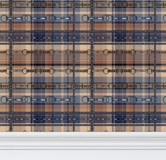 Blue and Brown Farmhouse Wallpaper Bit and Rein Pattern Plaid Luxury Equestrian Home Decor
