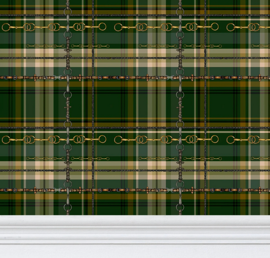 Hunter Green Equestrian Wallpaper Fox and Hound Decor Bit and Rein Pattern Traditional Red and Brown Plaid Luxury Equestrian Home Decor