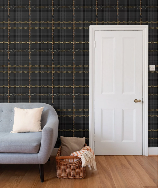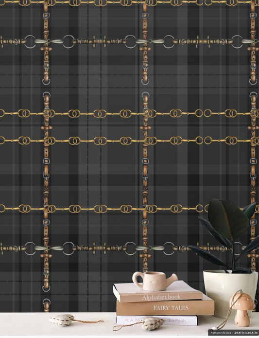 Black Equestrian Wallpaper Bit and Rein Pattern Plaid Luxury Equestrian Home Decor