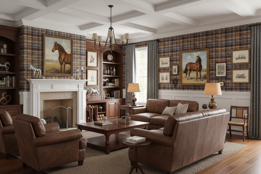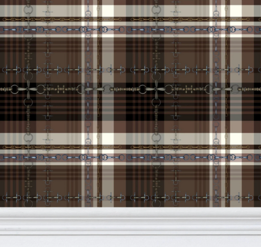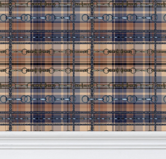 Blue and Brown Farmhouse Wallpaper Bit and Rein Pattern Plaid Luxury Equestrian Home Decor