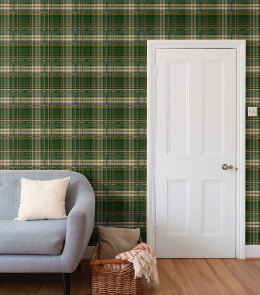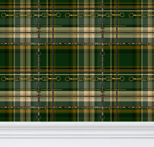 Hunter Green Equestrian Wallpaper Fox and Hound Decor Bit and Rein Pattern Traditional Red and Brown Plaid Luxury Equestrian Home Decor